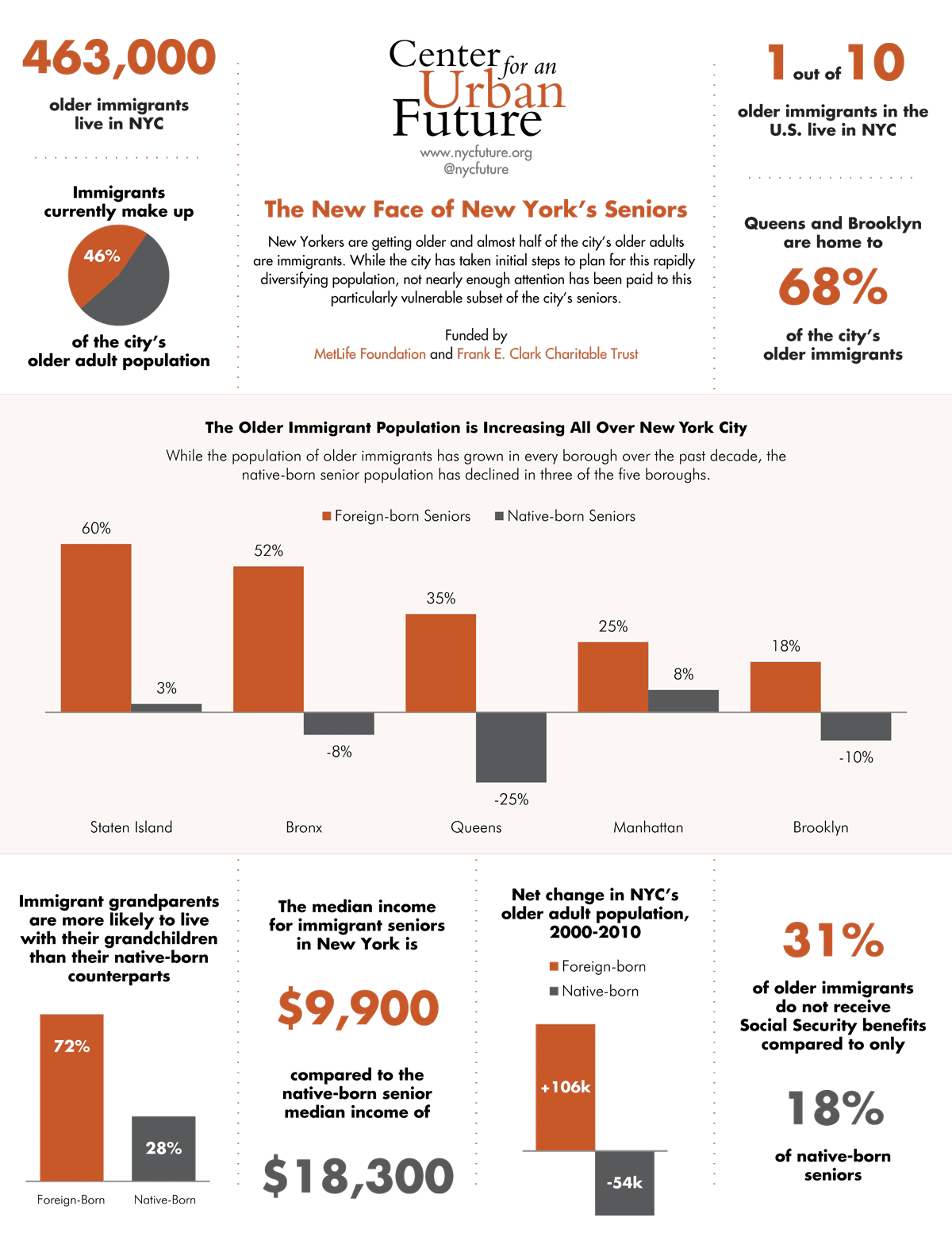Drawing on Census data, this report provides extensive demographic details about New York’s older immigrant population, including where they immigrated from, how long they’ve lived in New York City, which neighborhoods they live in and how many have access to government assistance, among other important factors to their well-being. In order to better understand the challenges foreign-born seniors face and how well the city is prepared to meet those challenges, we interviewed over 50 caseworkers at community-based organizations, advocates for immigrants and older adults, government officials, academics and a wide variety of policy experts in health care, community development and social services. Together, the data and first-hand accounts paint a picture of an increasingly international senior population in New York, with challenges and needs that are both common to all older New York residents and unique to their immigrant status or even their ethnicity or country of origin.